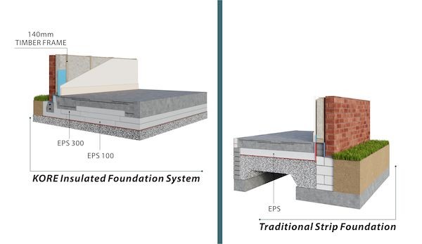 This isn’t the only place where I’ve spent more than absolutely necessary out of a desire to make calculating and building the thing easier – the foundations are fully wrapped with insulation instead of being traditional strip foundations, which would be cheaper. This is the difference, picture courtesy of KORE: