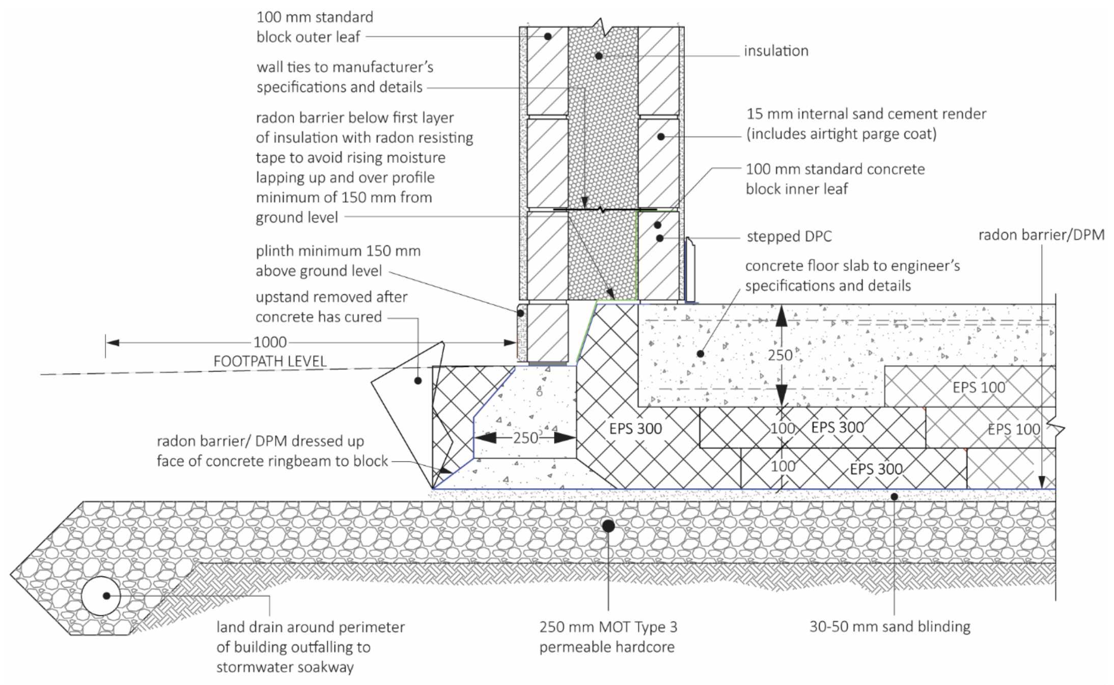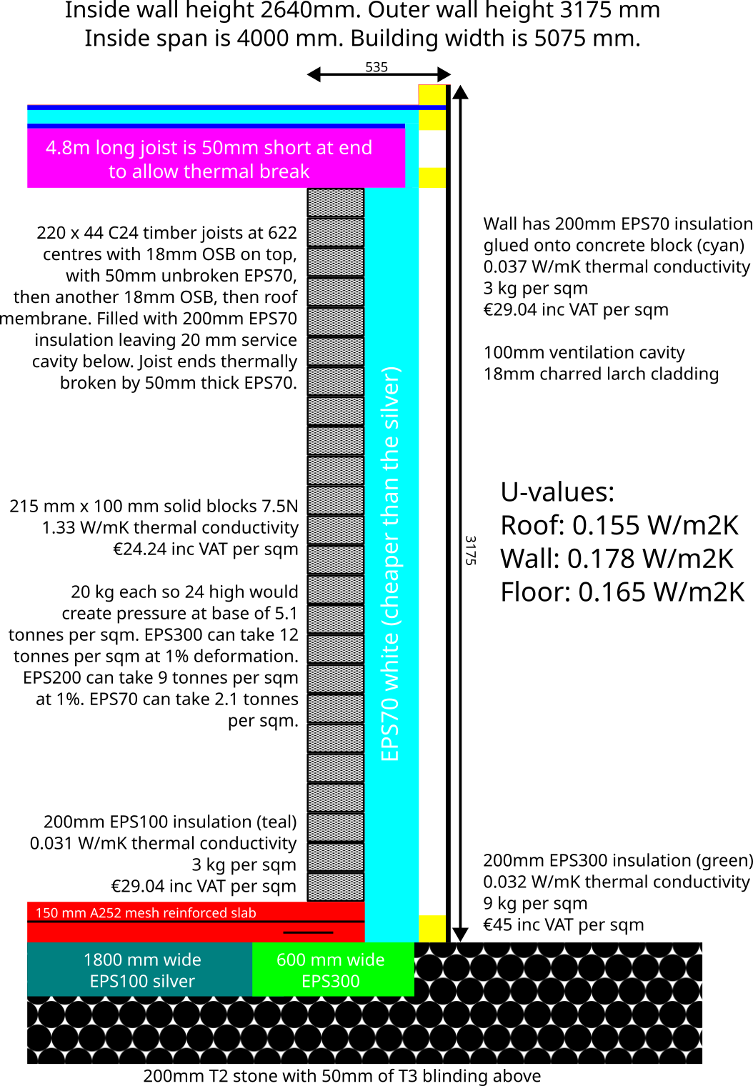 As you can see, the u-values are just below the Irish legal maximums, except for the floor. You’ll also see the more expensive graphite enhanced EPS100 in the floor. This is to match thermal conductivity with the EPS300, which while a bit more expensive it does makes things easier as you don’t need to care about potential interstitial condensation differentials etc. There is another motivation: the walls and roof can be easily upgraded later if needed, whereas the floor that’s likely there forever. In fact, that’s the motivation behind the perhaps excessive 100 mm ventilated cavity, if down the line we want to add +50mm of EPS to the walls without changing the outside, it should be very easy to do so.