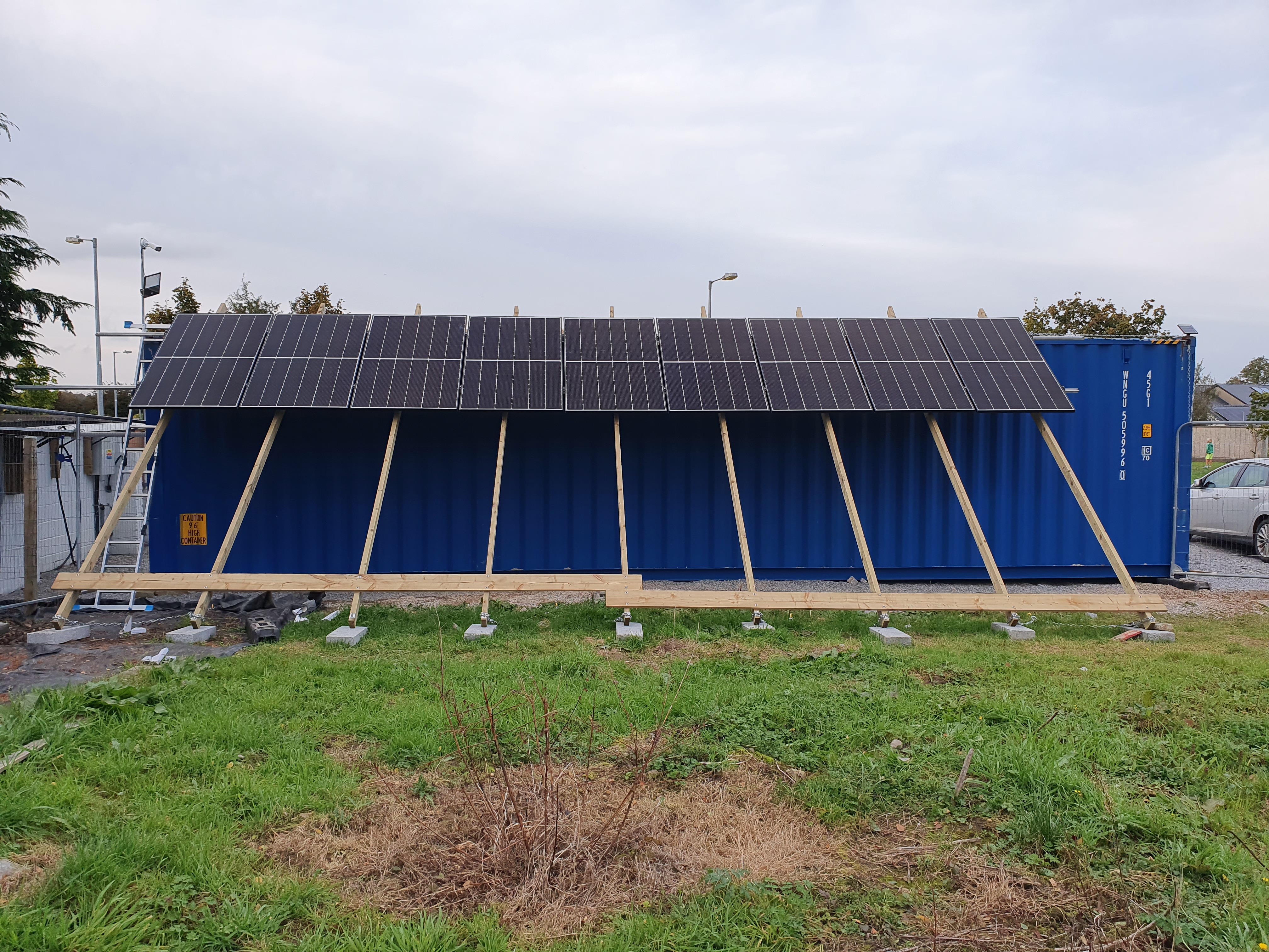 - The solar panels were installed at a forty degree angle rather than the planned forty-five degrees due to the terrain’s influence. The legs of the structure were chained horizontally to ground anchors and the top of the shipping container, with each chain capable of handling 250 kg or 150 kg respectively. The Q Cells 375w solar panels arrived, measuring 1.72m x 1.05m each and weighing 20kg.