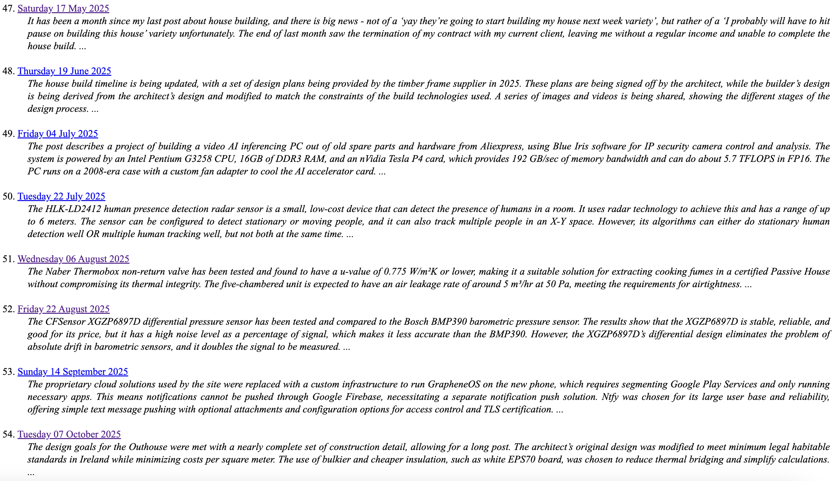 - The website has been improved by using a locally run language model AI to auto-generate metadata for virtual diary entries. The AI summarises the key parts of each post into seventy words, making it easier to find relevant information.