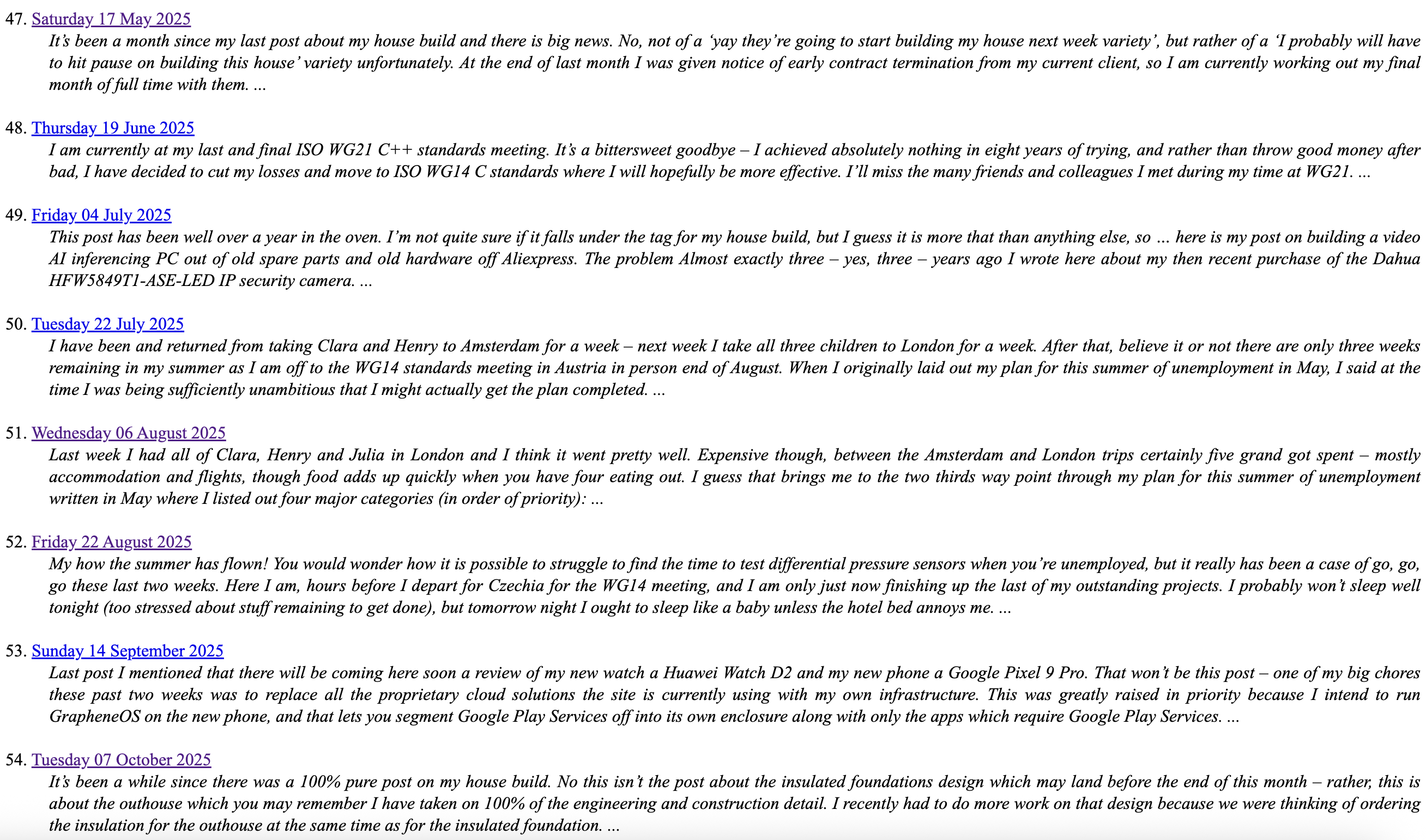 I manually reviewed everything the LLM wrote. 80-85% of the time what it wrote was acceptable without changes – maybe not up to the quality of what I’d write, but squishing thousands of words into seventy words is always subjective and surprisingly hard. A good 10% of the time it chose the wrong things to focus upon, so I rewrote those. And perhaps 5% of the time it plain outright lied e.g. one of the entries it summarised as me having given a C++ conference so popular it was the most liked of any C++ conference talk ever in history, which whilst very nice of it to say, had nothing to do with what I wrote. On another occasion, it took what I had written as ‘inspiration’ to go off and write an original and novel hundred words on a topic adjacent to what I had written about, so effectively it had ignored my instructions to only summarise my content only. Speaking of which, here are the prompts I eventually landed upon as ‘good enough’ for llama 3.1 8b: