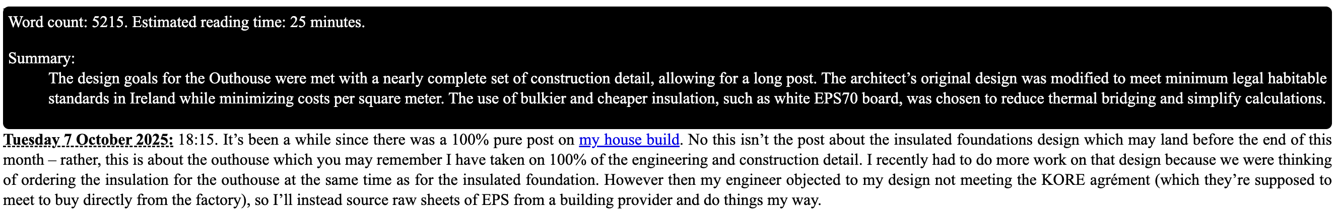 Hugo, the static website generator this website uses, if not manually overridden it auto-generates a summary of each virtual diary entry by taking the first seventy words from the beginning. This is better than nothing for trying to find a diary entry on some aspect of the house build you wrote at some point in the past three years, however the leading words of any entry are often not about what the entry will be about, but rather about other things going on, or apologies for not writing on some other topic, or other entry framing language. In short, the first seventy words can be less than helpful, noise, or actively misleading.