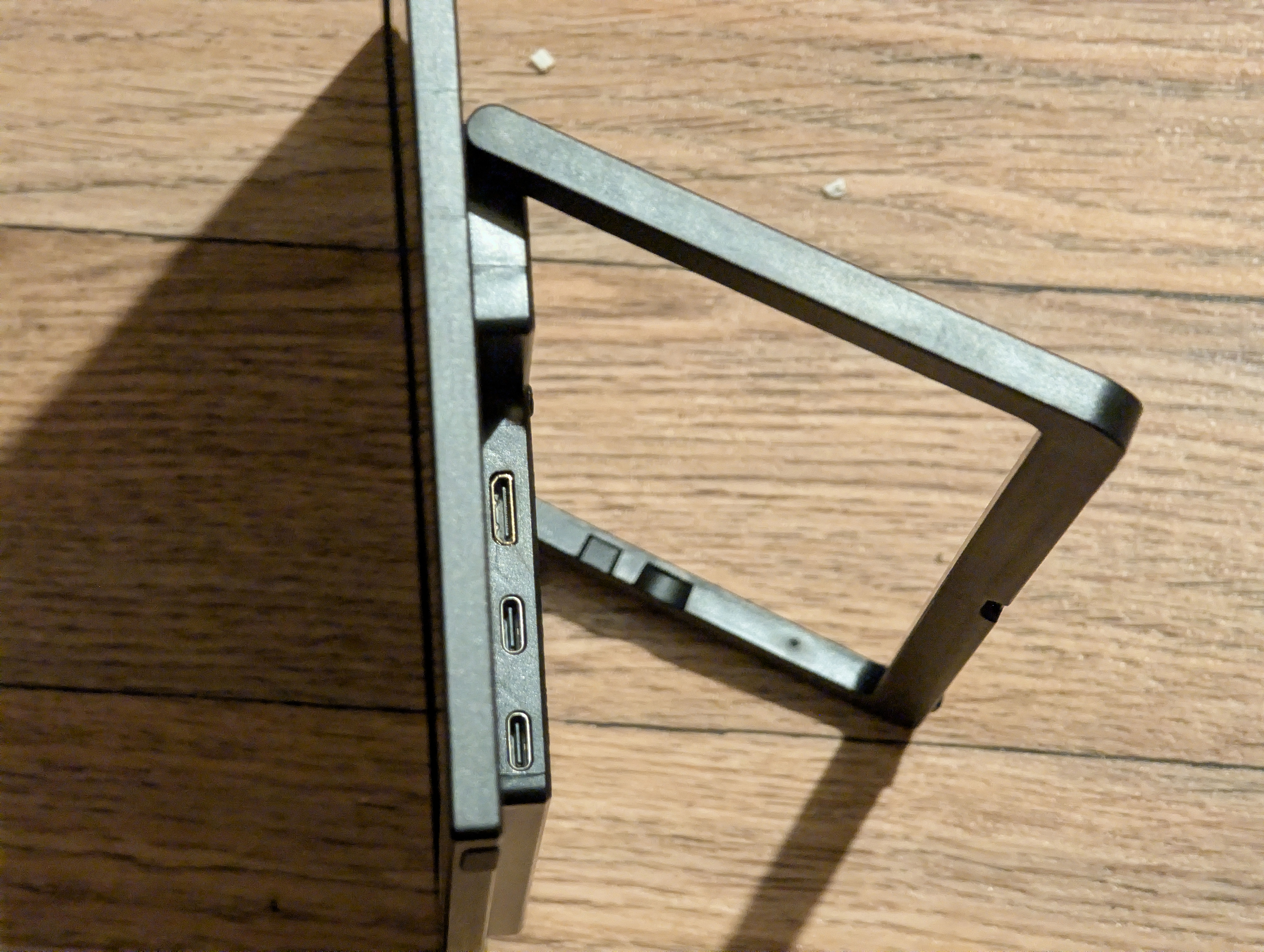 As you can tell from the fingerprints, this is a glossy display, not the matt display which the Aliexpress listing claimed. This was a worrying initial impression during unboxing as some Aliexpress items can deliver something quite far from the listing claims. At least the integrated stand is indeed sturdy and well made, though the case is cheap plastic as you’d expect at this price point (and the USB-C sockets are not as robustly attached as I’d prefer). Things got better when I plugged it in: