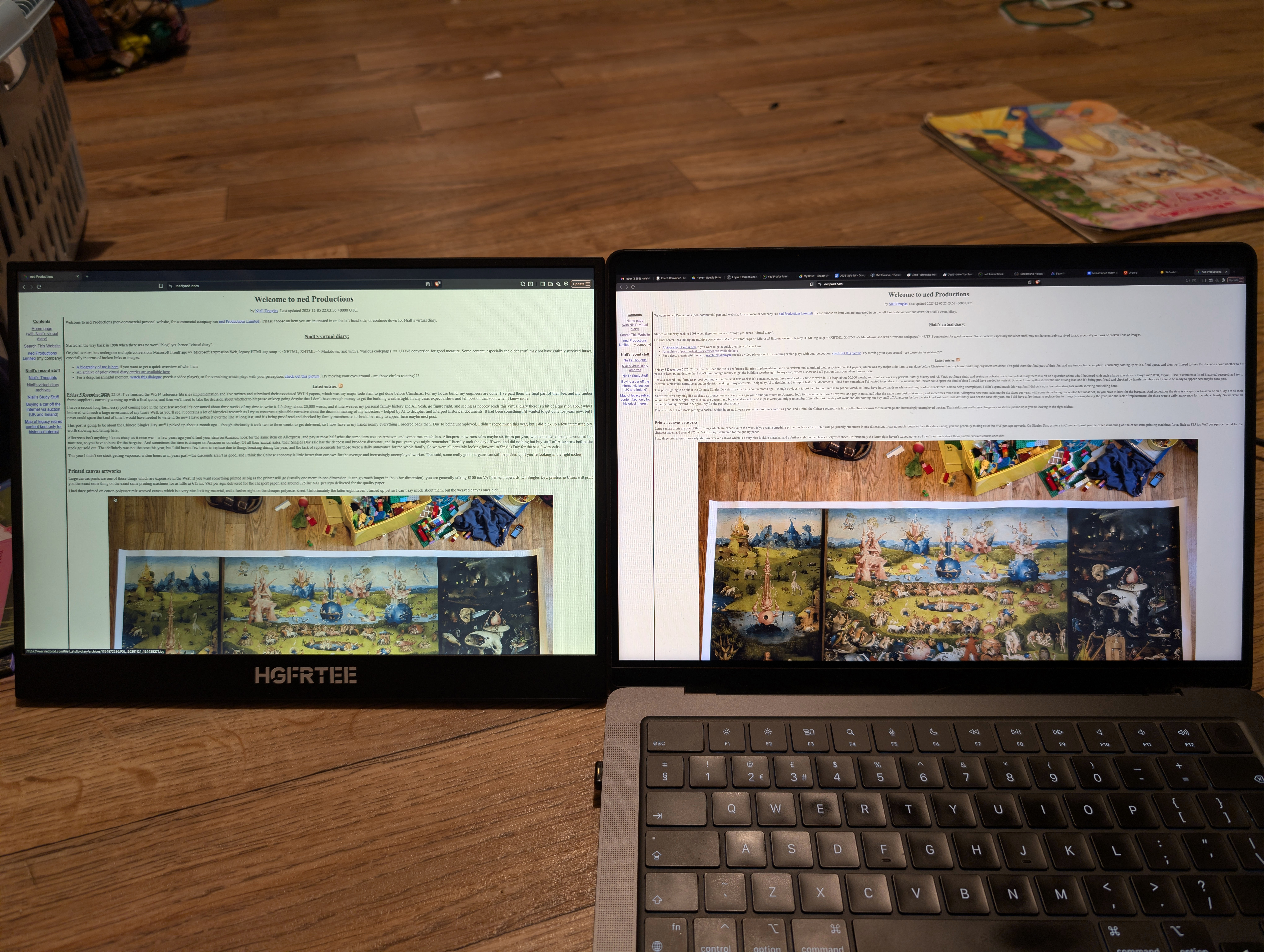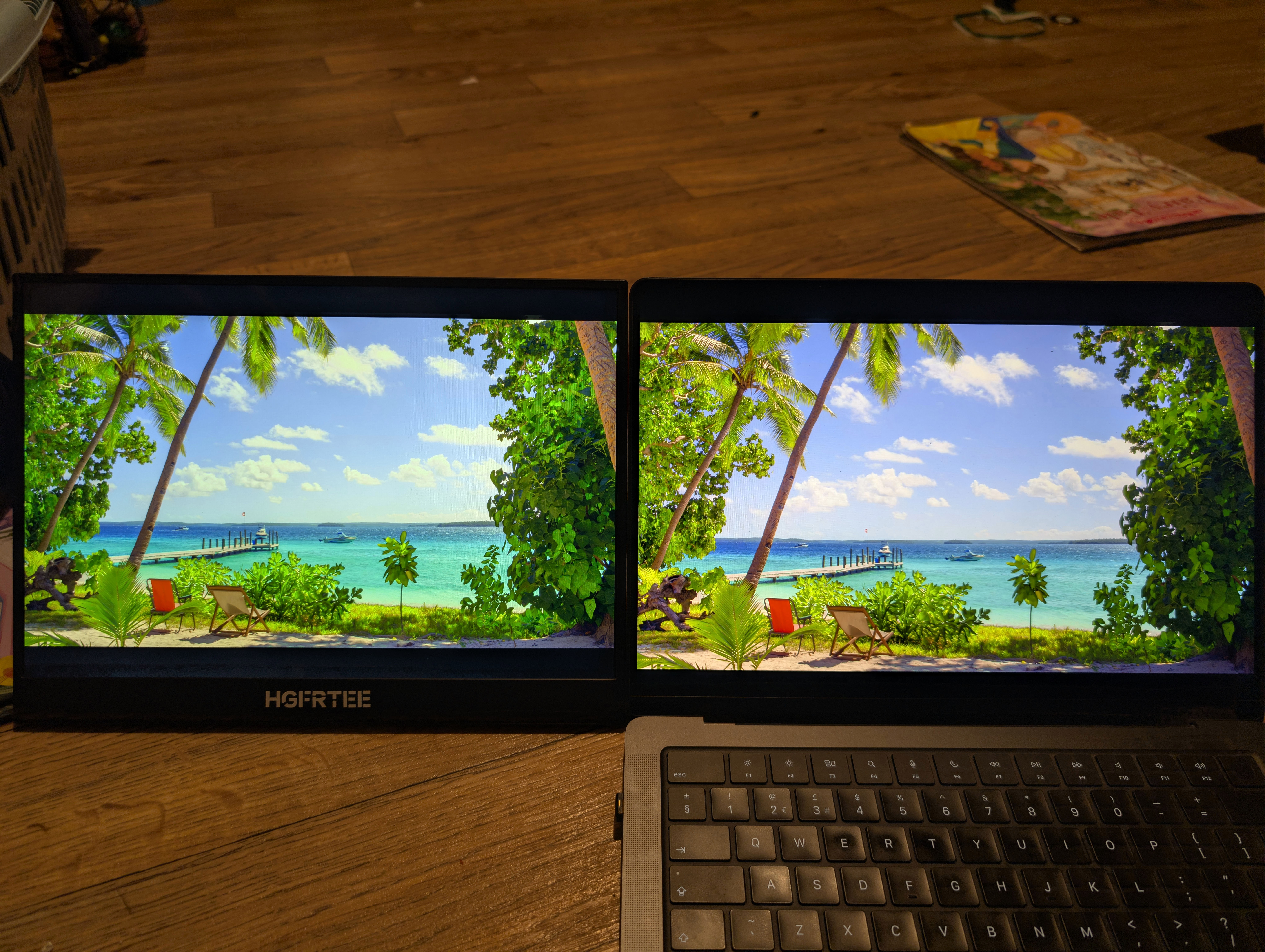 This display reminds me a lot of the panel that was on my Dell XPS 13 laptop from 2019. That panel could render more than sRGB, it could go quite bright, and yes it was better than a SDR display. But wasn’t capable of getting more than part of the way towards DCI-P3 of which the Macbook Pro’s display can render 99% coverage. Watching HDR movies on that old Dell laptop often had you wondering if what was being rendered was so clamped by gamut limitations that it might be better to watch an SDR edition of the movie instead. This display is better than that: if this portable monitor didn’t have the green tint, I think I’d always use it in HDR mode. But, it does have that green tint, so I will only ever use it in SDR mode where the colours aren’t all slightly green. I never expected to be watching movies on it anyway – why would you if you have a Macbook Pro? I had just been curious if an eighty euro monitor can genuinely do HDR nowadays. And, yes it can! And I’m very pleased with this purchase, it has exceeded expectations and it ticks all the use case boxes for which I bought it.