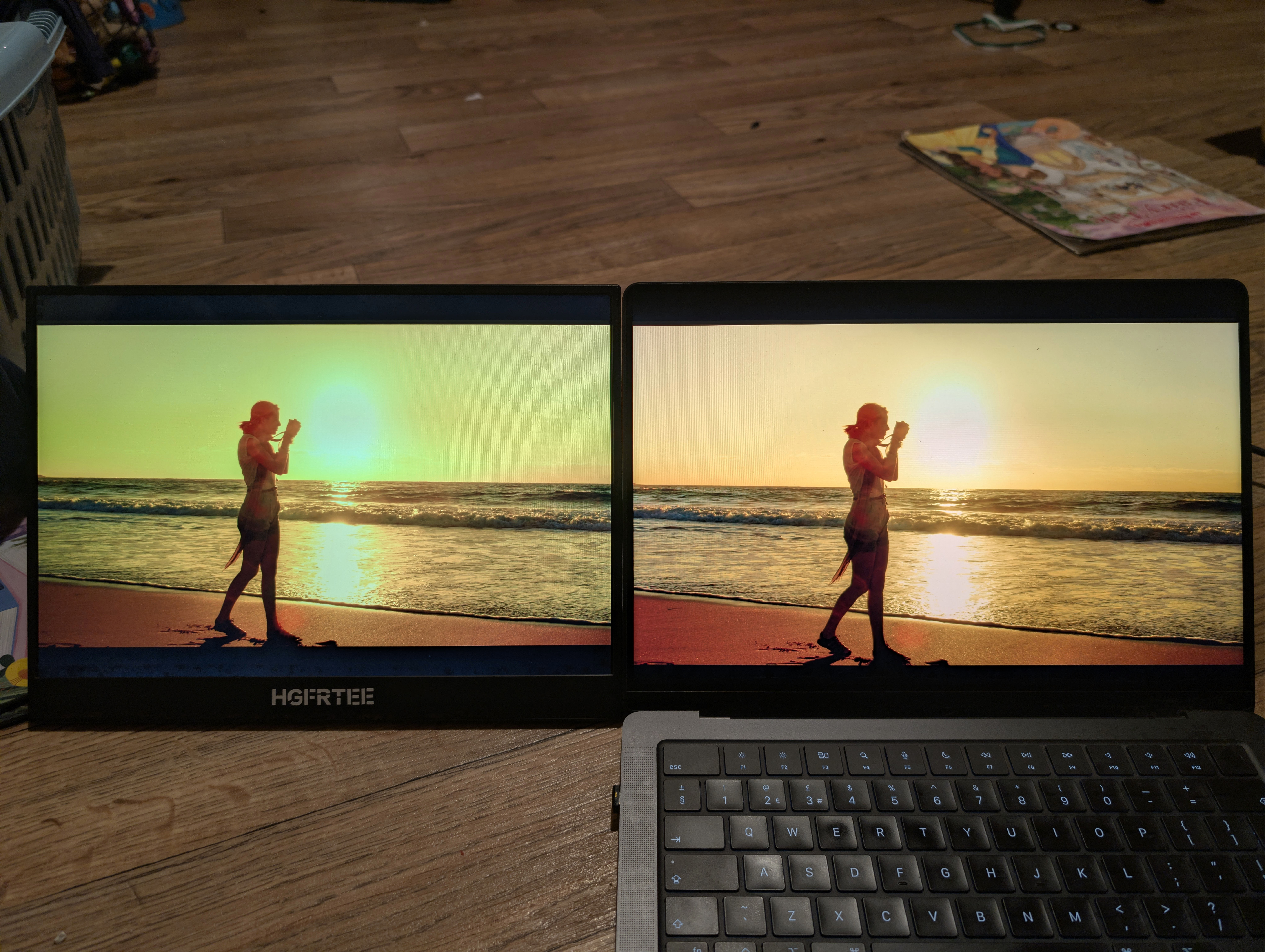 The Macbook Pro has one of the best non-OLED displays currently available, and no this ultra cheap portable monitor is not as good. But it makes a fair stab: this is both displays rendering a HDR test video: