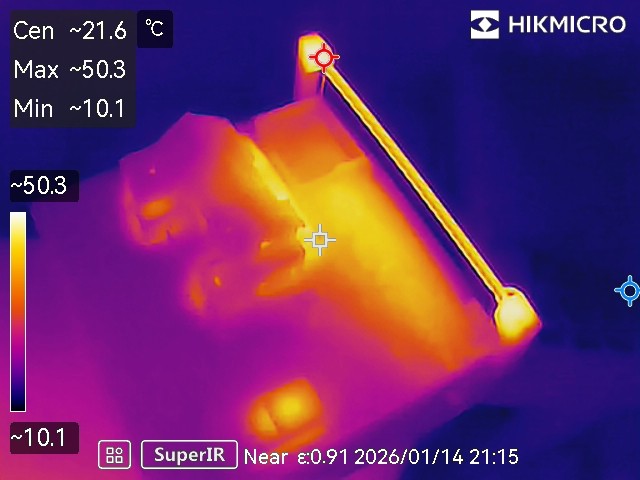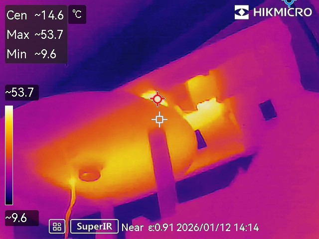 Looks like on full power after twenty minutes with the case on we get a maximum 54 C or so. Now, it being winter here, the surroundings are cold so that could easily be 10-15 C more in summer. But it wouldn’t matter – ASA plastic has a glass transition temperature of 100 C. And, besides, we’ll never run the lights at full power, they’re too bright so they will be at most on a 33% PWM dimming cycle.