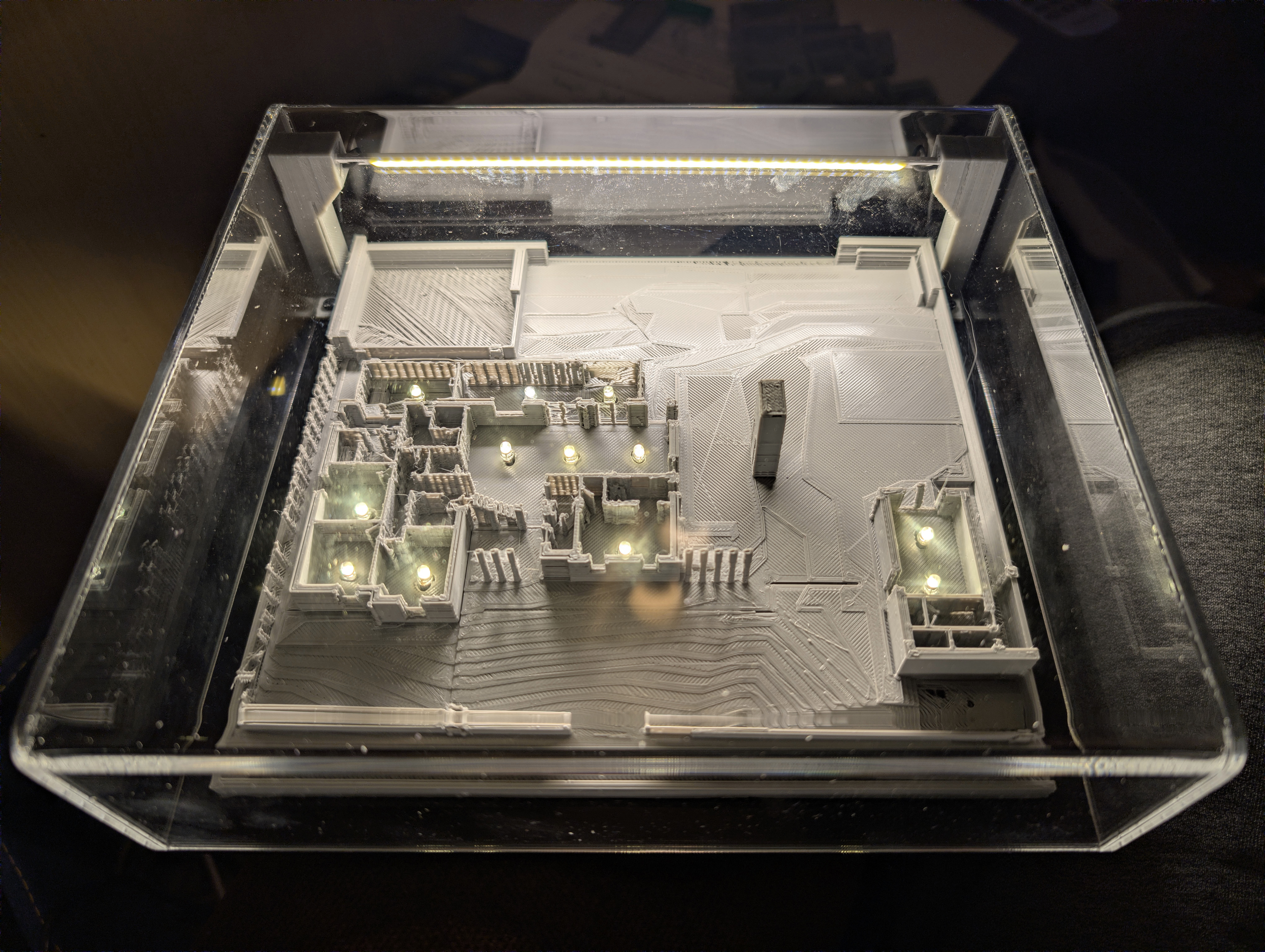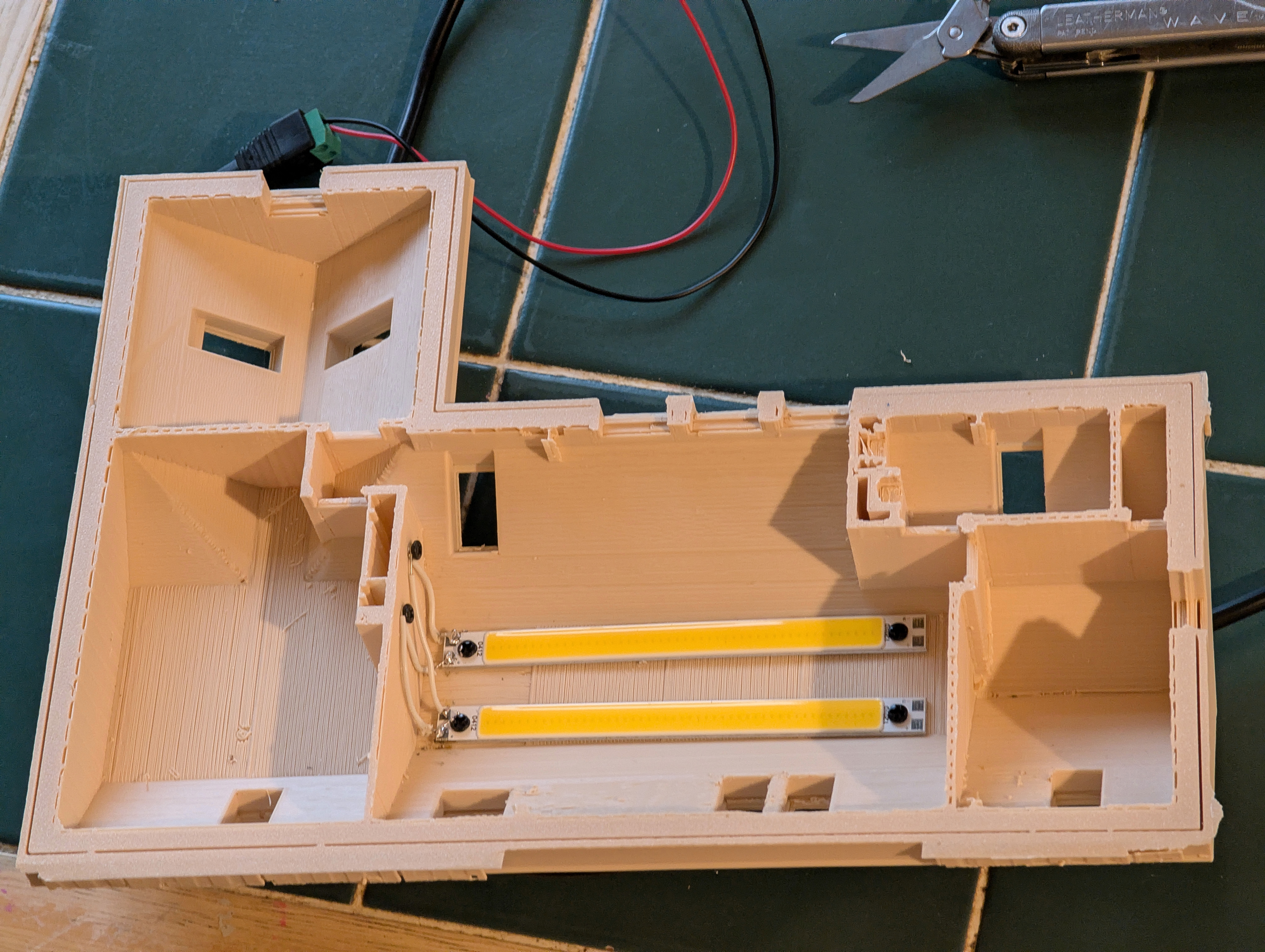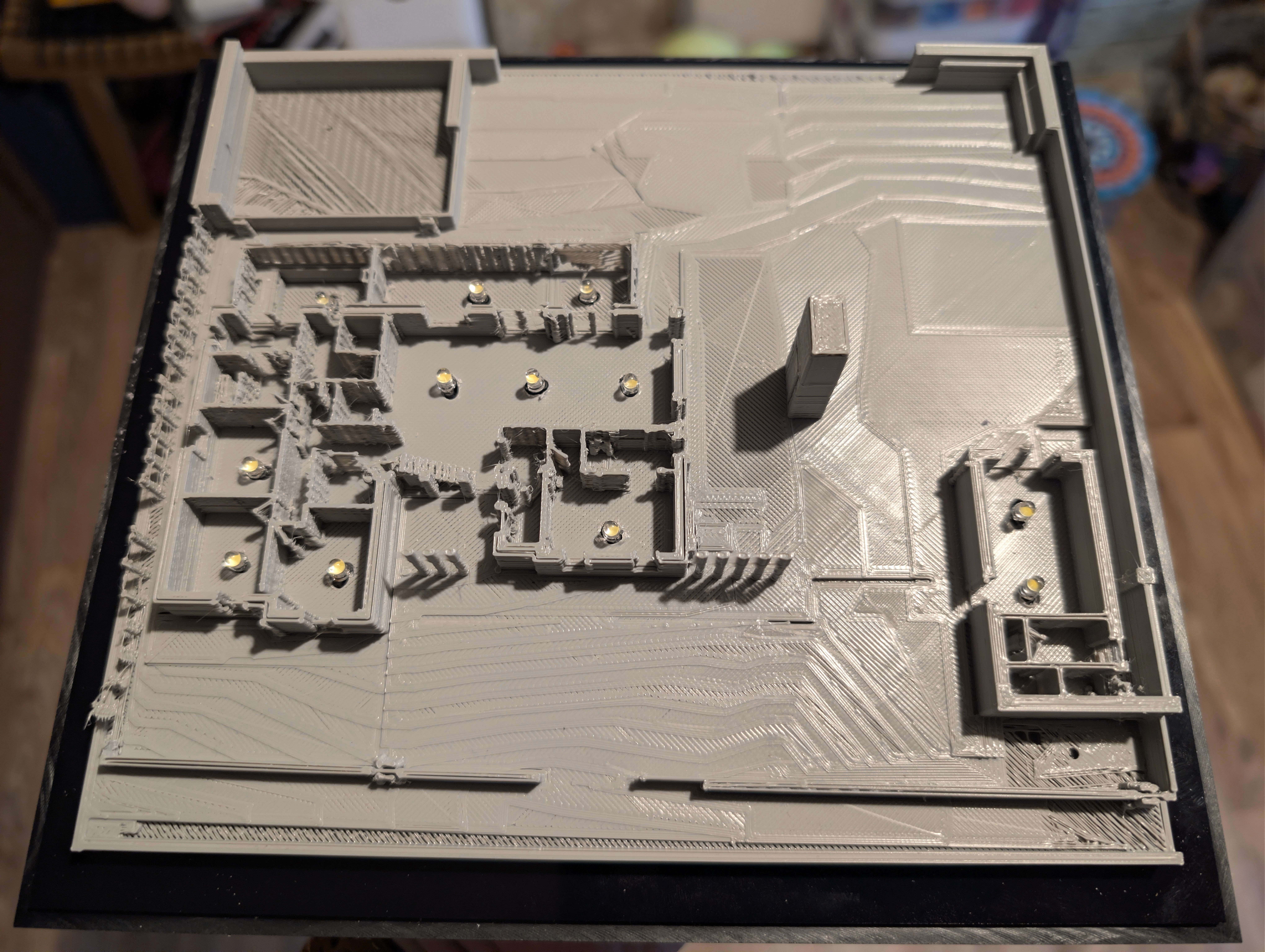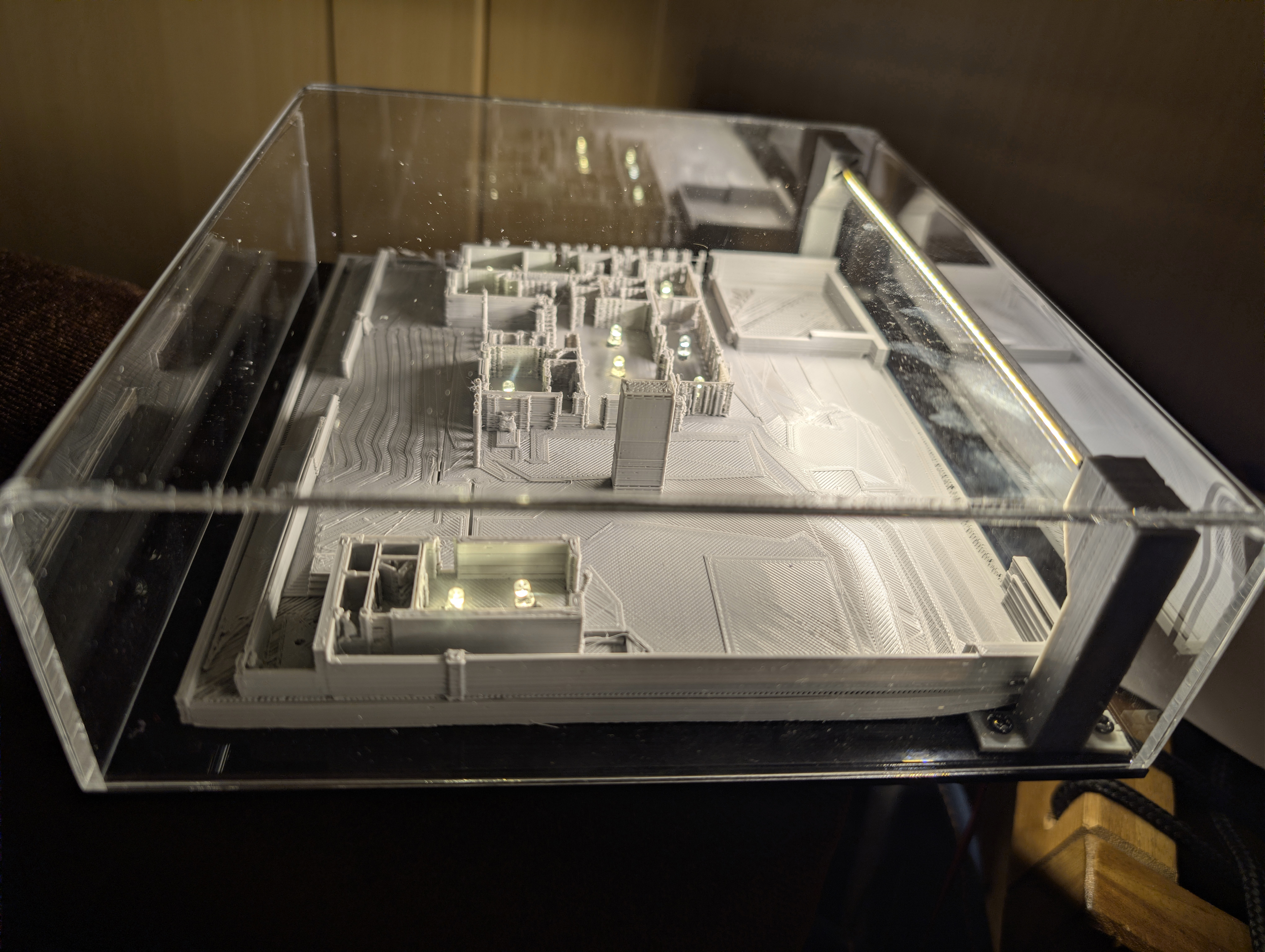 You may or may not remember that using my own personal 3D printer I had also printed the whole site. This isn’t very big as it’s limited by the 20 cm x 20 cm maximum plate on my personal 3D printer, but it gives you a good sense of how the house and outhouse frame the site. Anyway, I started by inserting 4 mm LEDs throughout the house and outhouse: