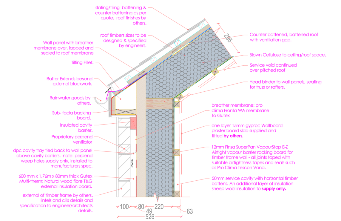 The rafters are at 400 mm centres whereas the walls will be at 600 mm centres, so there is a ‘seat’ running on top of the wall studs which is called ‘head binder’ in the diagram above. The 295 mm thick rafters extend out as far as the fascia and soffit backing boards, which I think will be 35 mm thick wood, and it appears to be 150 mm tall. They show a 225 mm tall fascia being affixed externally, but theirs misses the lip at the bottom: