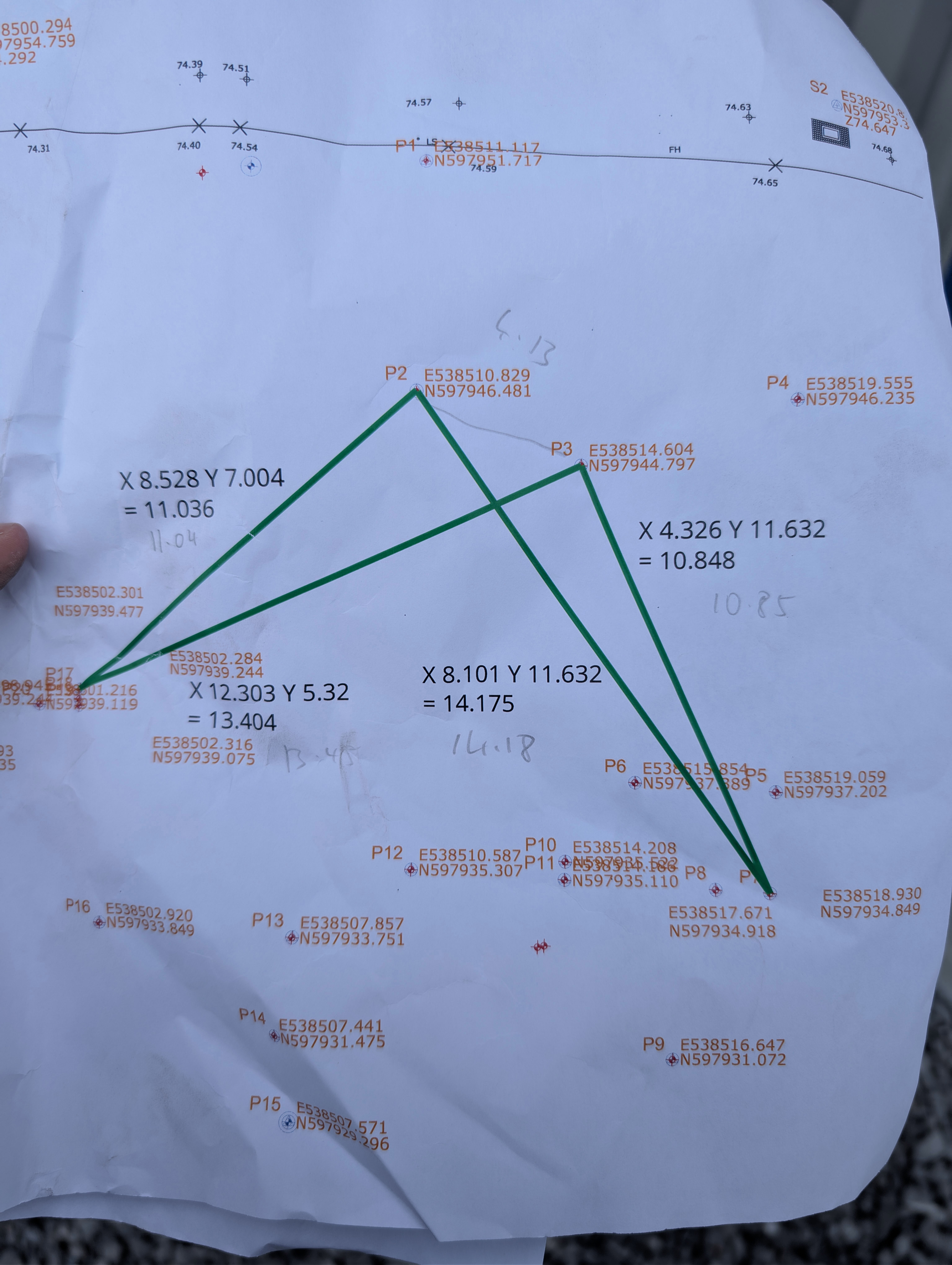 If you look closely, you will see that the yellow points map onto the plan perfectly except in the bottom left. That, at the time, introduced a fair panic because it was days before I took the kids to England, and groundworks were supposed to start yesterday morning the day after I got back. Obviously my surveyor was also rather panicked, so he supplied me a list of X-Y values for each point on the site as marked. I then came up with a mechanism for validating the position of the errant points using known good points: