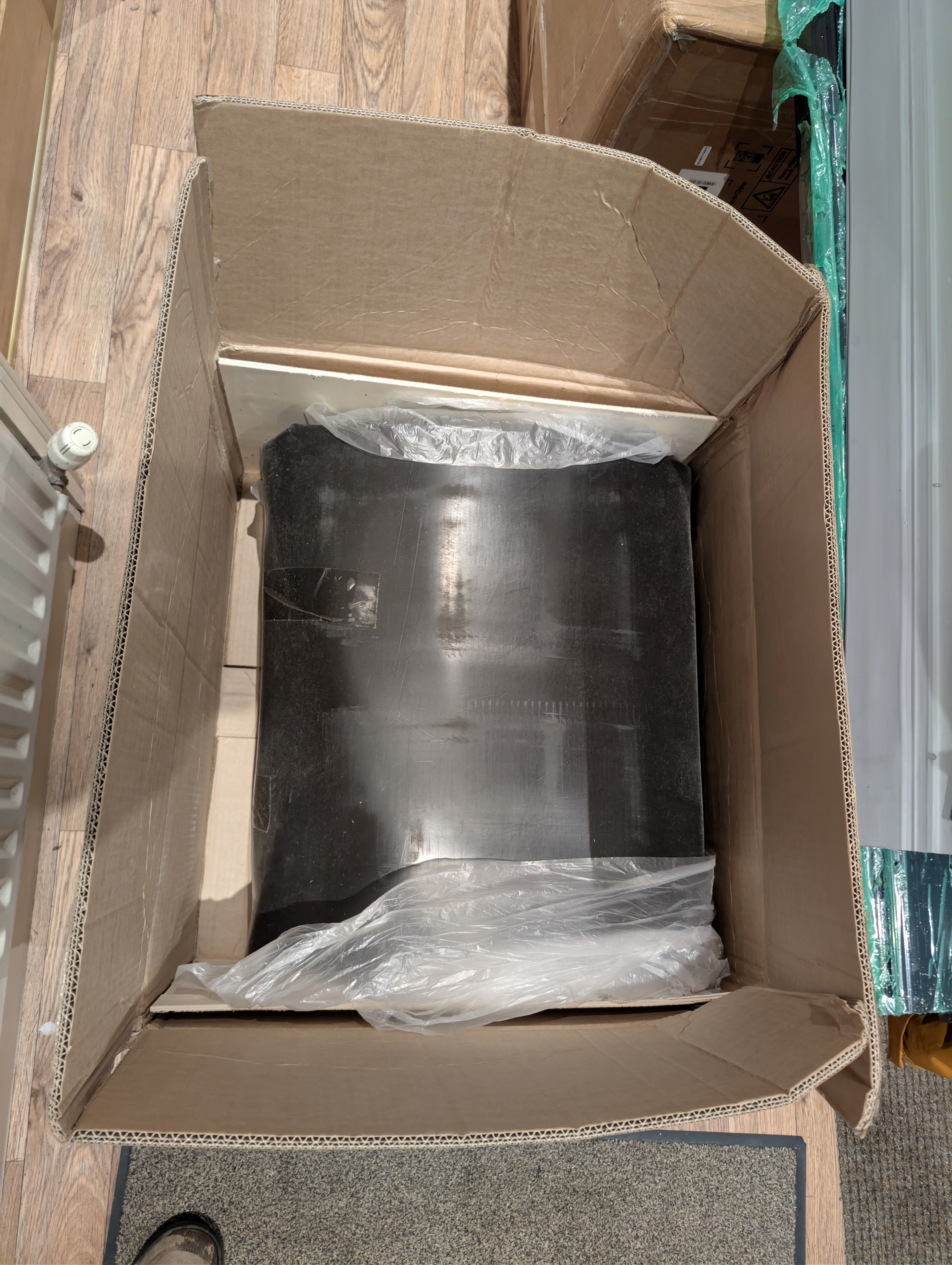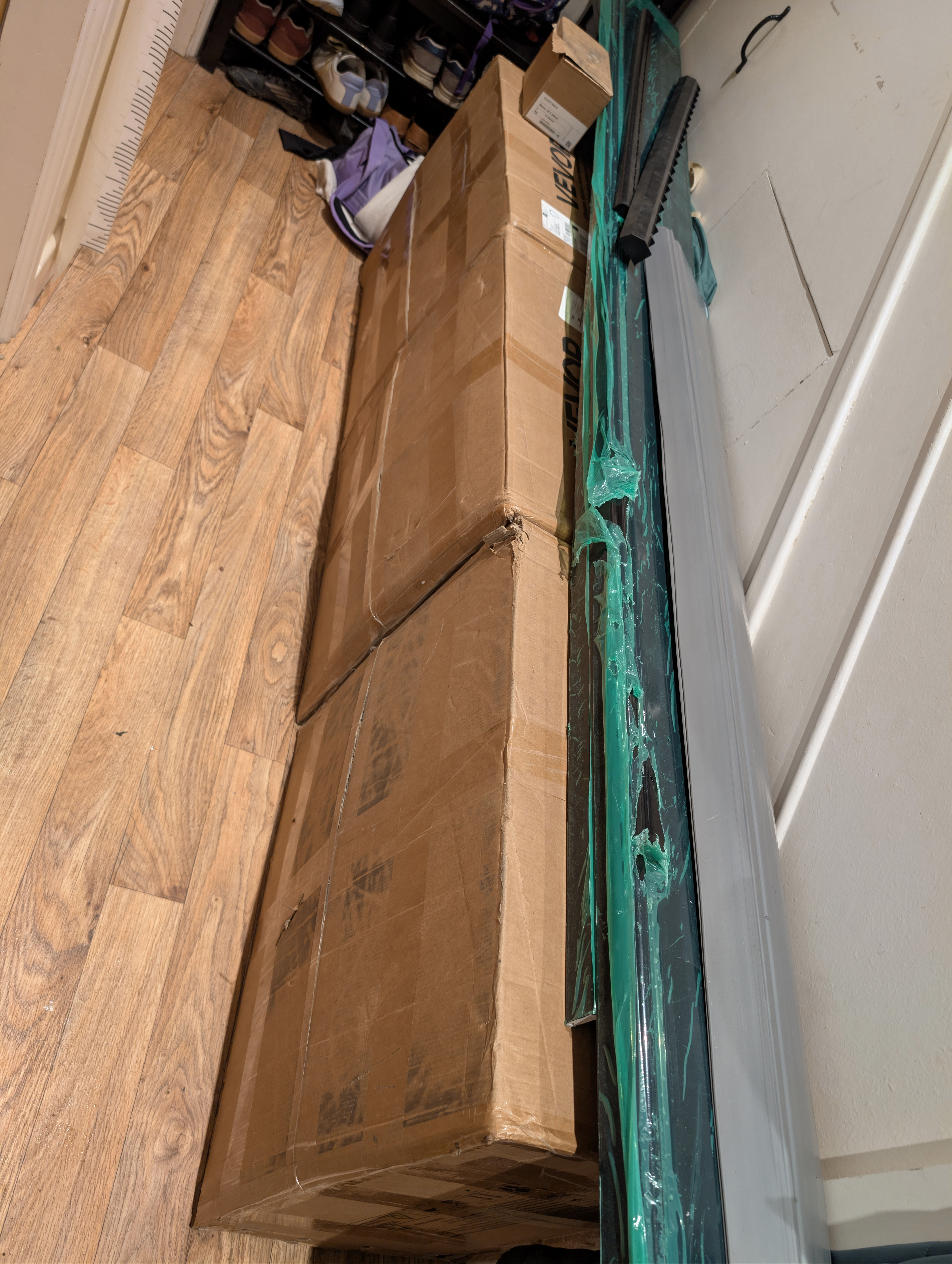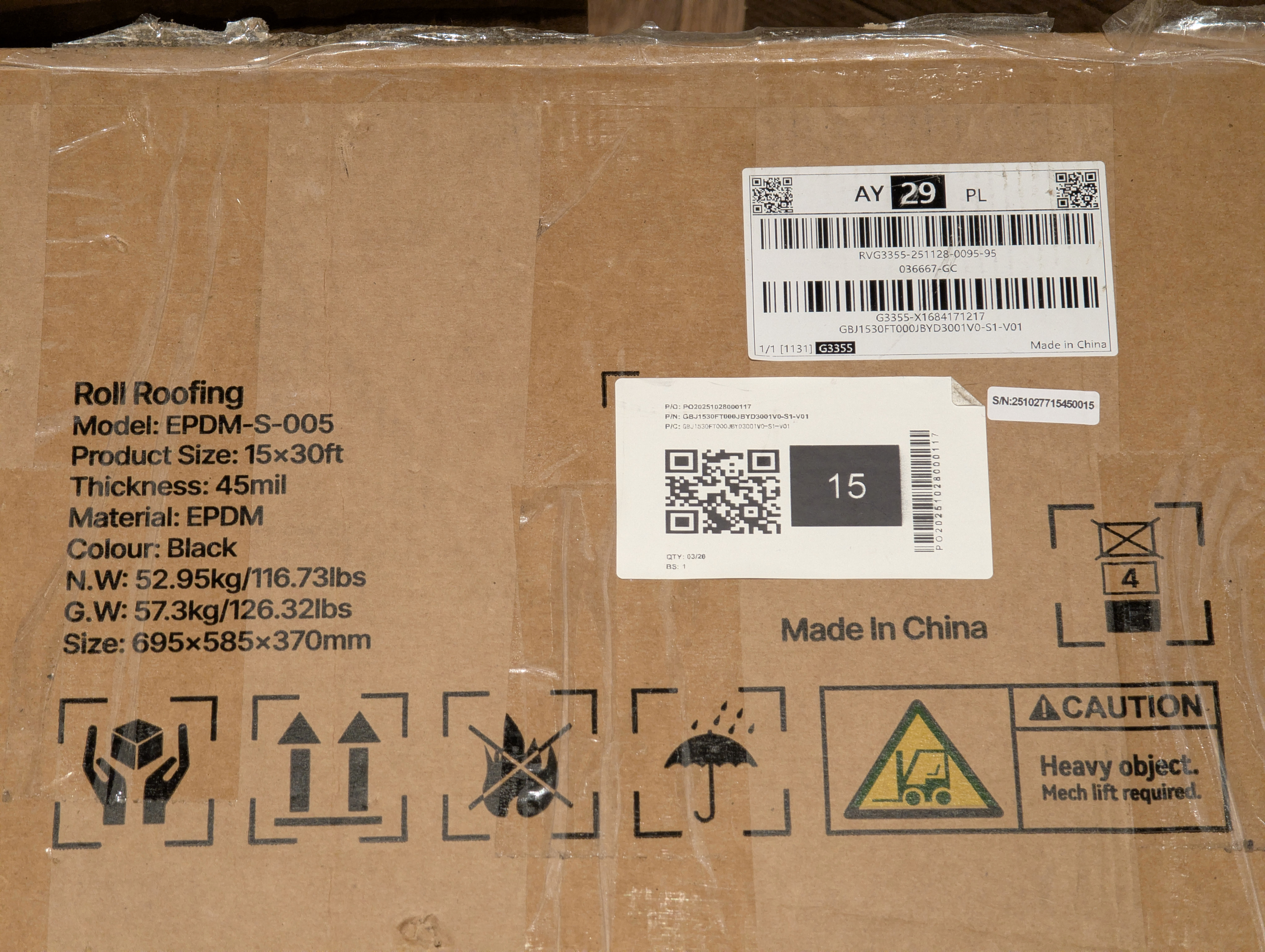 Those three large boxes contain €1,800 worth of EPDM membrane! Each box contains 40 sqm, so that is 120 sqm in total, and the thickness is 1.14 mm which is a grade above the 1.0 mm stuff sometimes used for residential applications. It weighs a lot, 57 kg per box: