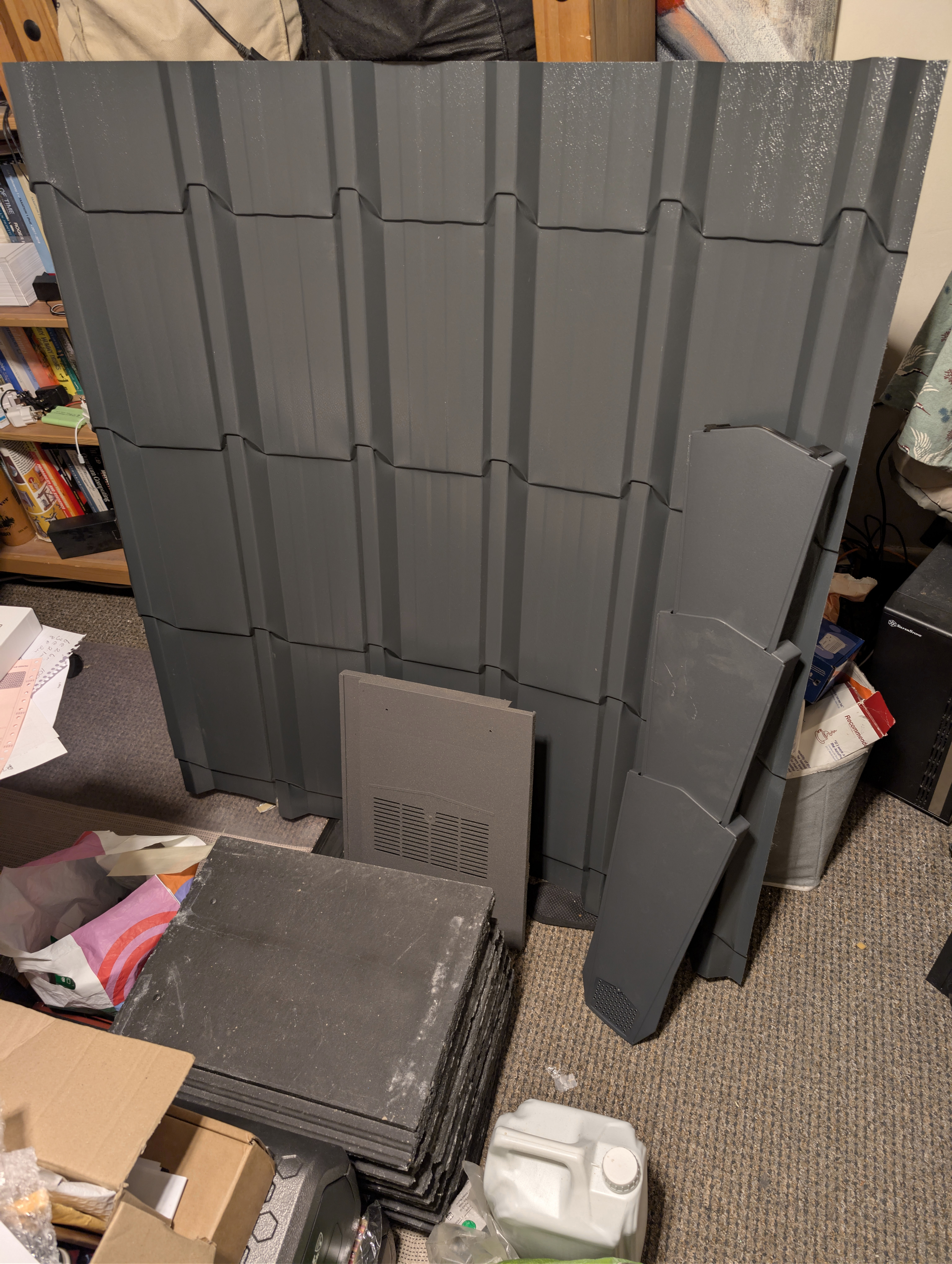 The big sheet is a sample of the ‘roof tile effect’ metal roof panel from Irish Rollforming; at its bottom is a concrete roof tile ventilator used for ventilating the roof near the ridge; to the right of that is the cheapest available plastic verge which is nasty but looks sufficient; bottom of picture is a stack of concrete roof tiles. All I am currently missing is the wood from which to construct an example eave, which will be to this design: