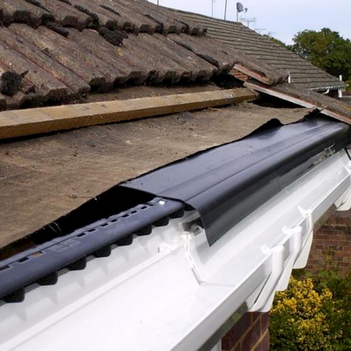 I think that means that the fascia will be 10-12 mm lower at the top, and one would therefore extend the fascia upwards with a 10 mm ventilator to support the eaves tray. The alternative is a 150 mm tall fascia, but that would stop short of the subfascia board which then would get in the way of the 25 mm ventilator – also the resulting total would be 175 mm tall, which from their diagram looks to be not enough. In any case, the eaves tray then runs from under the roof membrane over the tilting fillet then over the over-fascia ventilator with it tipping into the gutter. This is much easier to show than describe in words, so here is a picture of somebody else’s eave: